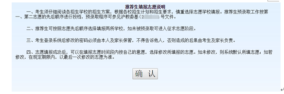 推荐志愿和自荐志愿采取网上志愿填报和书面志愿确认相结合的方式进行,只有经书面志愿确认后才能参加投档录取。本市应届初三学生书面志愿确认在就读初中学校进行,应届返沪考生到报考区招考机构进行书面志愿确认。书面志愿确认只核对志愿信息,不得更改志愿或补报志愿;未在规定时间进行书面志愿确认的考生,视作自动放弃市实验性示范性高中和市特色普通高中“提前招生录取”。