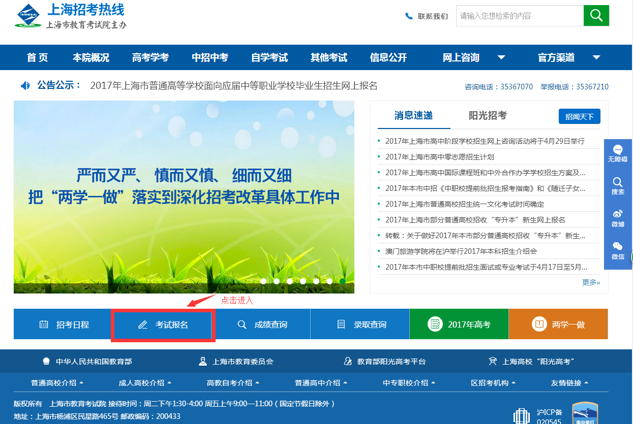 登录网址:上海招考热线(www.shmeea.edu.cn)主页上的醒目位置有图片链接入口,如下图: