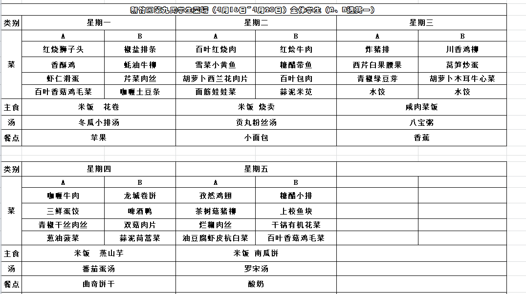 上海民办新竹园第九周学生菜谱(4月16日~4月20日)