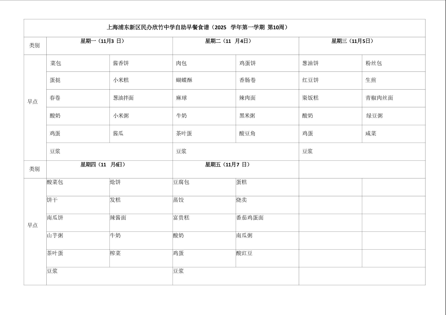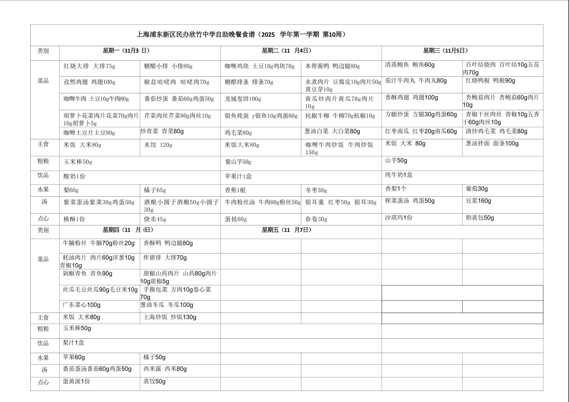 上海浦东新区民办欣竹中学自助餐食谱(2025 学年第一学期 第 10 周)