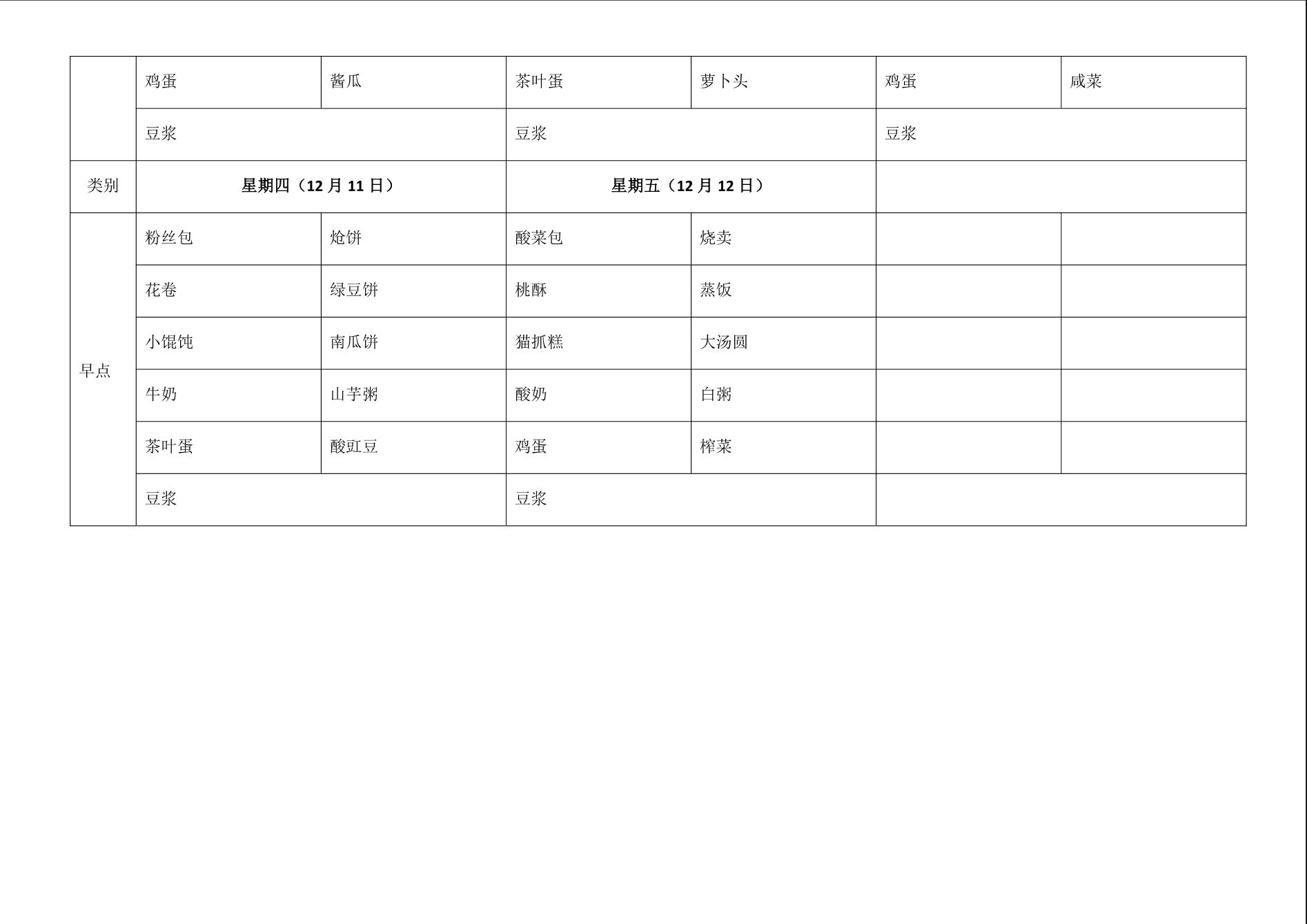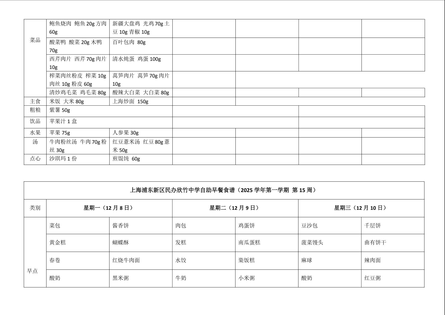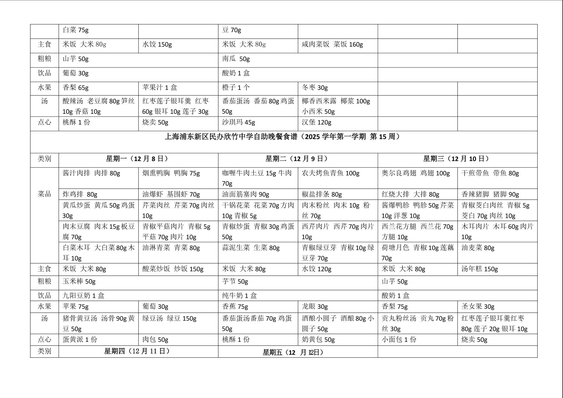 上海浦东新区民办欣竹中学自助餐食谱(2025 学年第一学期 第 15周)