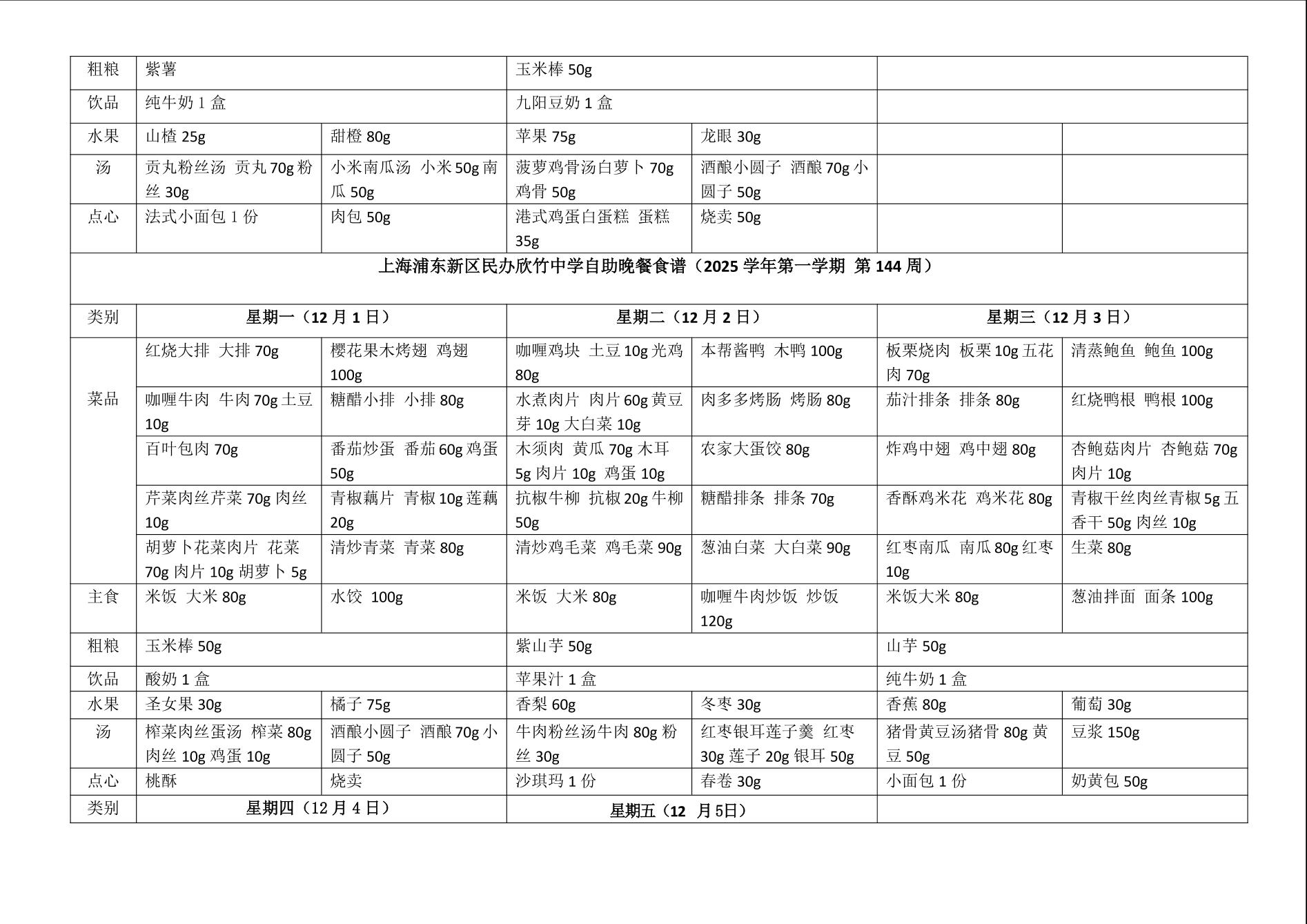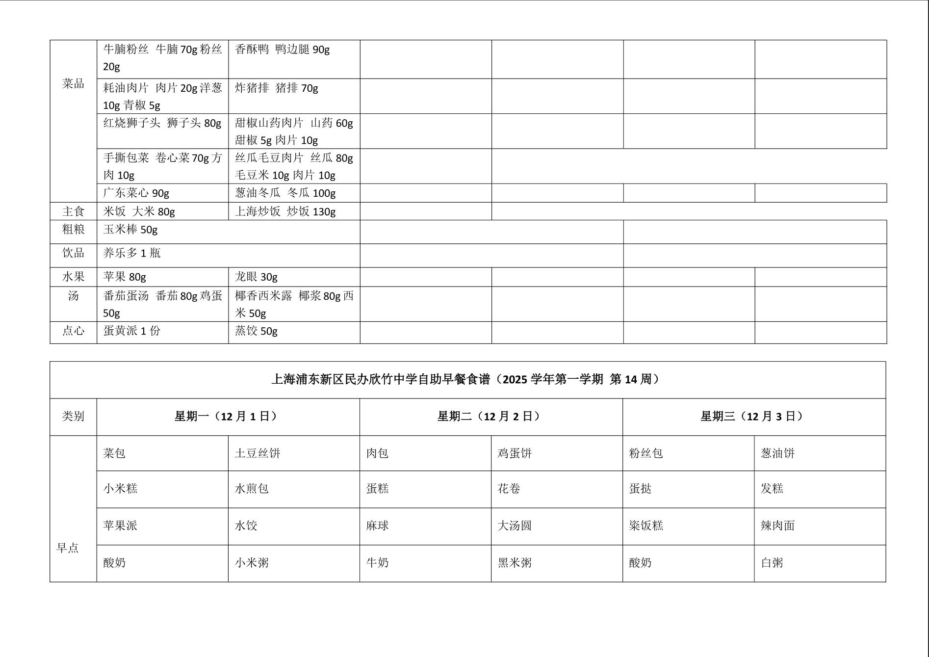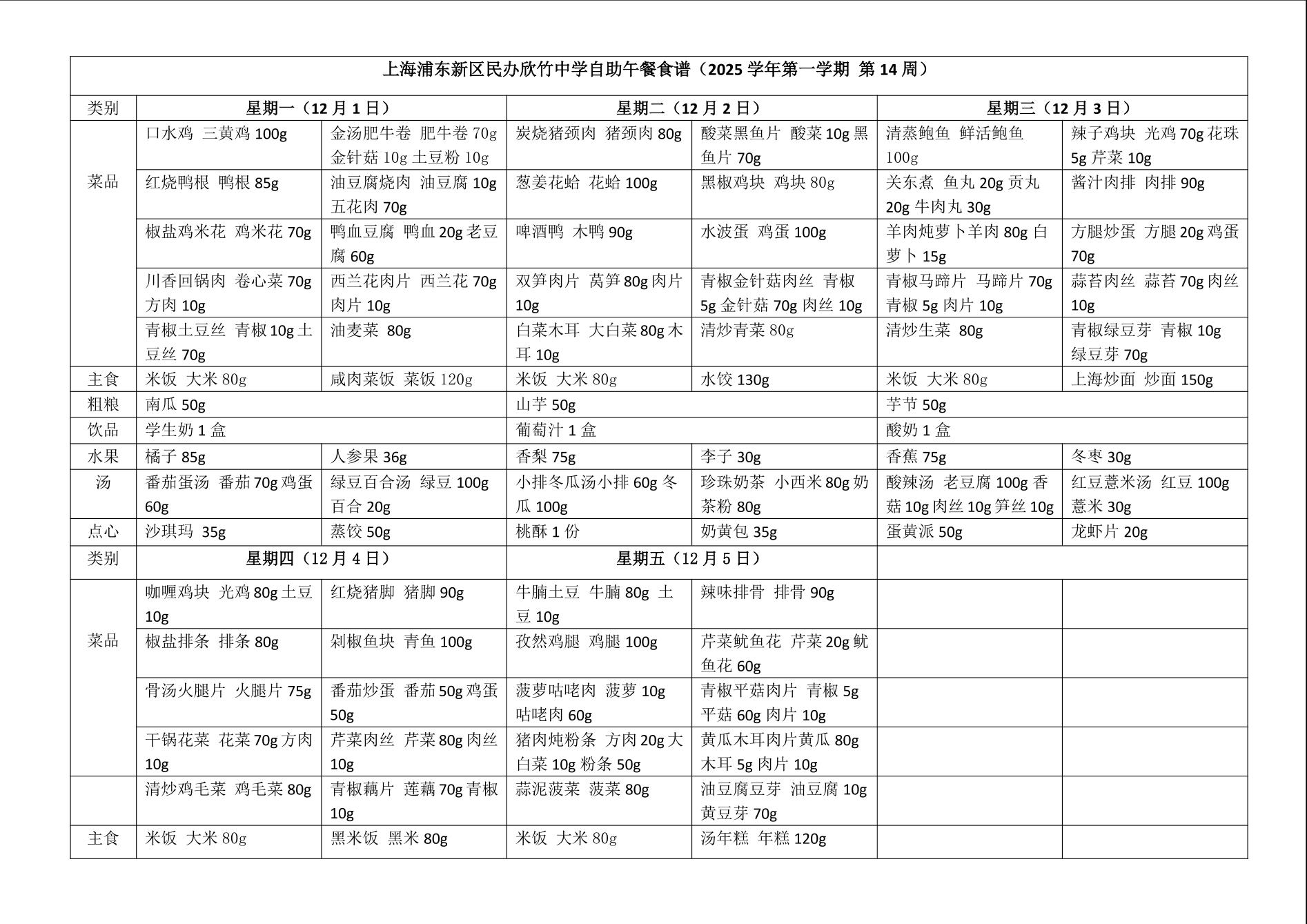 上海浦东新区民办欣竹中学自助餐食谱(2025 学年第一学期 第 14 周)