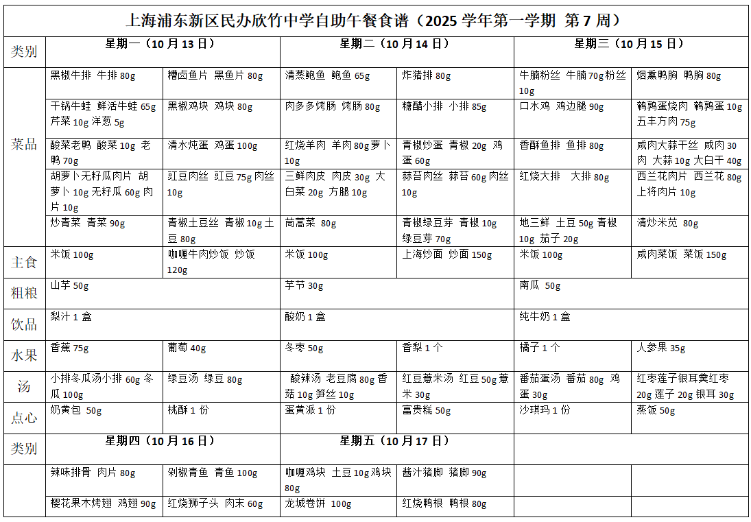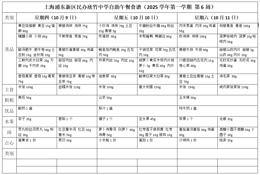 早餐A套B套C套D套E套肉包烧麦粽子大麻球粢饭糕千层饼桃酥南瓜饼猪猪包生煎大馄饨汤圆豆浆纯牛奶辣肉面鸡蛋鸡蛋鸡蛋鸡蛋鸡蛋晚餐周一周二周三周四红烧肉圆火石烤肠小烤鸡茄汁小排面包虾黄豆烧猪脚干烧鲳鱼椒盐鸡米花豇豆肉丝胡萝卜花菜肉片山药木耳肉片萝卜烧肉咖喱土豆炒菠菜炒鸡毛菜杭白菜番茄蛋汤贡丸粉丝汤+香蕉咸肉冬瓜汤榨菜蛋汤+酸奶米饭+春卷米饭+小烧麦米饭+南瓜饼米饭+虾饺