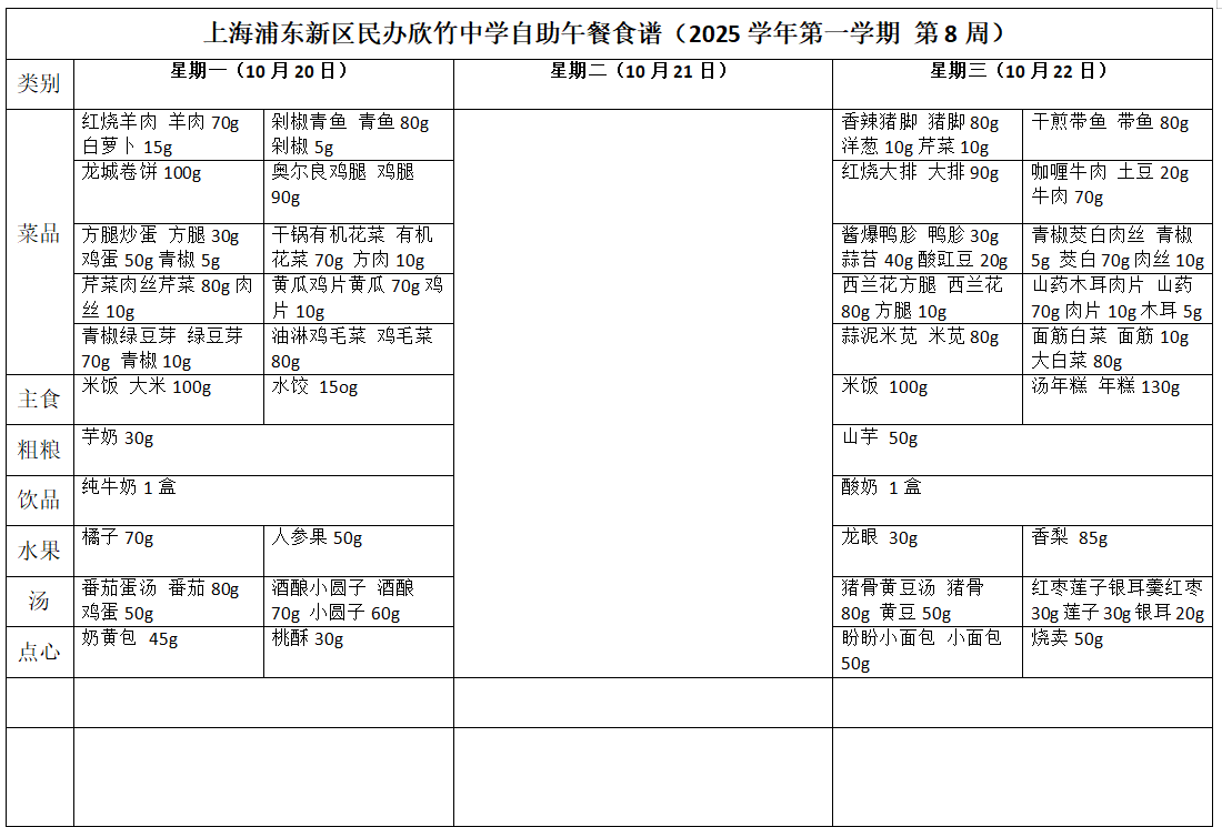 早餐A套B套C套D套E套鸡蛋饼黑洋酥包咖喱牛肉煎包葱油饼油条煎馄饨春卷虾饺蛋糕发糕豆浆水饺小馄饨纯牛奶红烧牛肉面鸡蛋鸡蛋鸡蛋鸡蛋鸡蛋晚餐周一周二周三周四咖喱鸡块面包蝴蝶虾杭椒牛柳本帮酱鸭骨肉相连红烧肉圆香酥鸡翅龙城卷饼烂糊肉丝芹菜肉丝干锅手撕包菜番茄炒蛋菠菜青椒绿豆芽杭白菜米苋米饭+南瓜饼米饭+花卷米饭+烧麦米饭+春卷贡丸粉丝汤番茄蛋汤+冰红茶酒酿小圆子榨菜蛋汤+酸奶