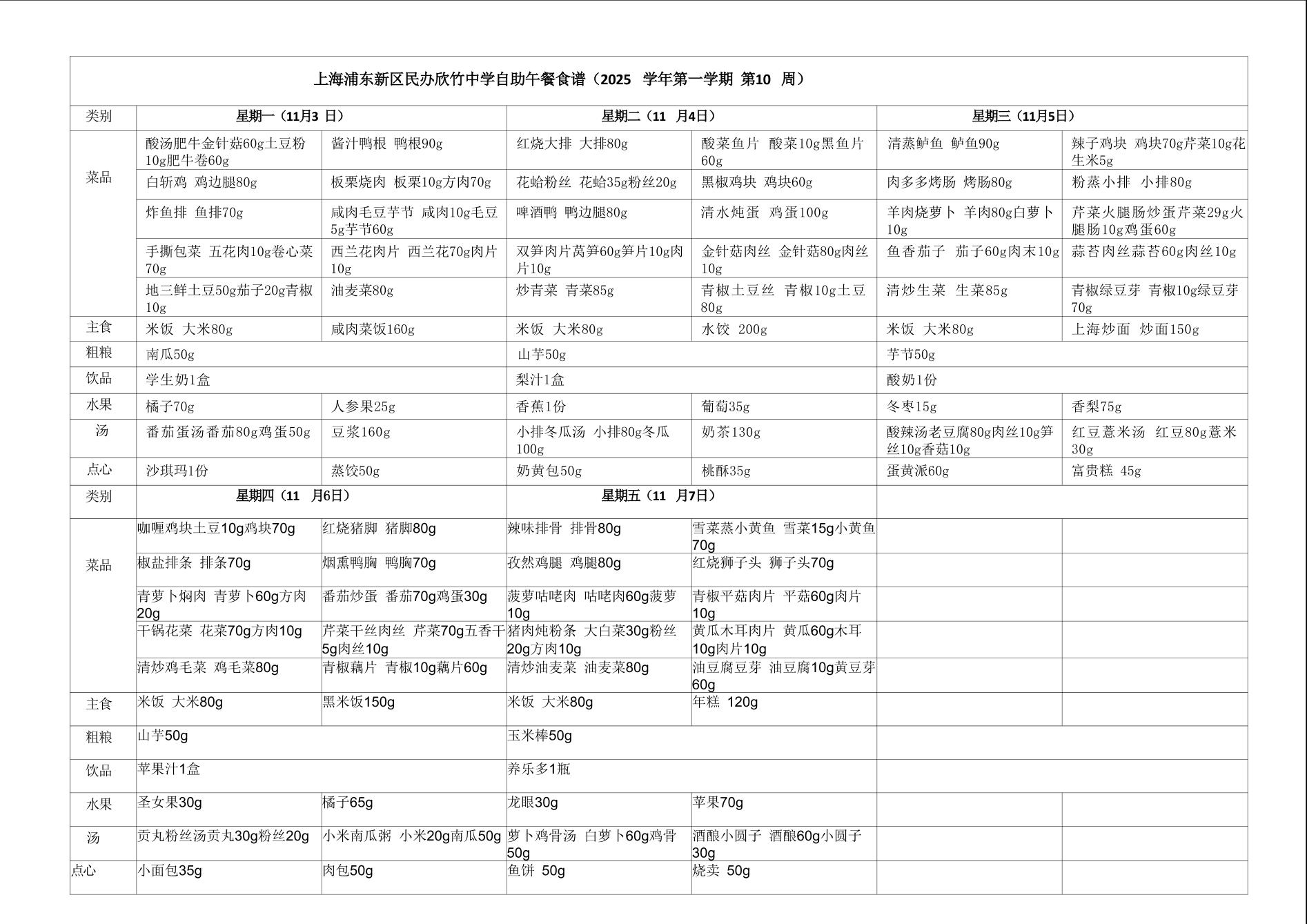 上海浦东新区民办欣竹中学自助餐食谱(2025 学年第一学期 第 10 周)
