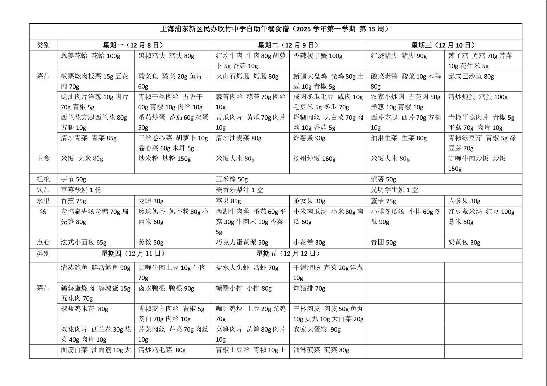 上海浦东新区民办欣竹中学自助餐食谱(2025 学年第一学期 第 15周)